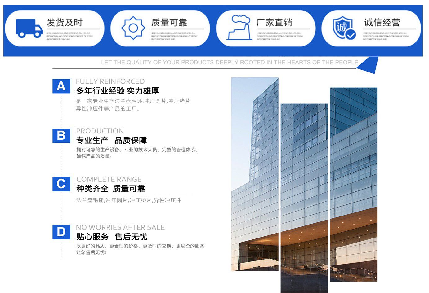 山東恒駿金屬制品有限公司是一家集生產法蘭盤毛坯,法蘭毛坯廠家,沖壓圓片,沖壓墊片,異性沖壓件生產廠家等產品,可根據客戶需要訂做各種法蘭盤毛坯。  多年來,以科學的生產工藝、嚴格的質量管理、先進的服務理念、合理的銷售價格,在國內外廣大用戶中贏得了良好的聲譽。  我公司成立迄今,正是由于各界朋友們對于我們的持續支持與關懷,及本公司全體同仁辛勤的耕耘與付出,使公司持續發展與茁壯成長。展望未來,我公司人懷著感恩之心,更加追求卓越的業績,來回饋社會,服務顧客。  我公司誠摯的希望與新老客戶在互惠互利、友好合作的基礎上,建立良好的貿易關系,歡迎各單位來人來函到我企業指導工作,我們有著一支優秀的員工團隊,我們堅信企業的競爭、產品的競爭、技術的競爭,歸根到底是人才的競爭,只有具備了高素質的員工才能形成高素質的企業,才能掌握市場競爭的主動權。  我公司理念:“誠實守信,雙贏有泰”,我們對待每位戶都遵循行業誠信,不虛報產品價格,客戶下訂單后我們抓緊生產,保證工期,我們愿與新老客戶本著精誠合作、互惠互利的原則建立廣泛的合作關系,相信通過我們的共同努力定能共創美好未來!  公司宗旨:信譽第一,誠信為本。  公司精神:創新是永恒的主題,超越是不懈的追求。  公司經營理念:以客戶為中心,質量為根本,信譽為生命。  公...